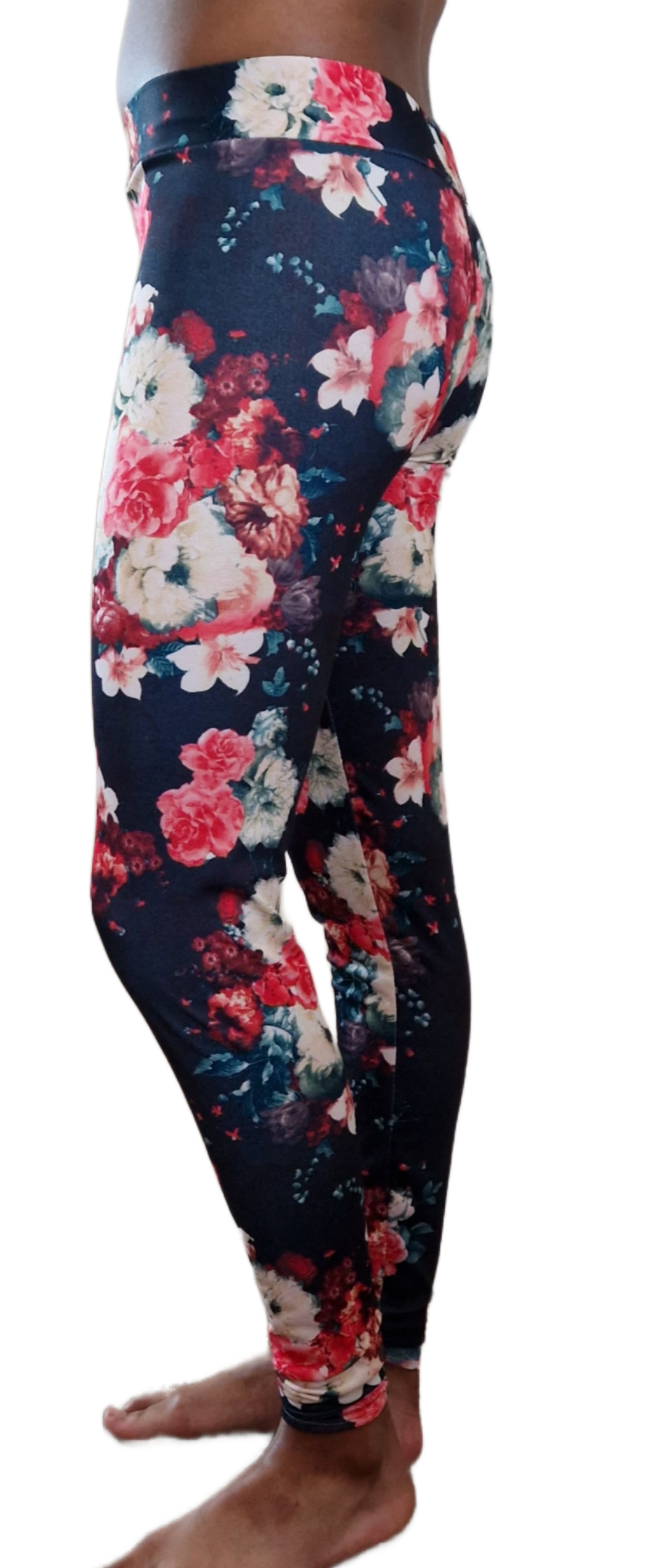Floral print stretch fabric leggings with a soft feel. These leggings are a midnight blue with floral patterns all over. Perfect for a summers day.